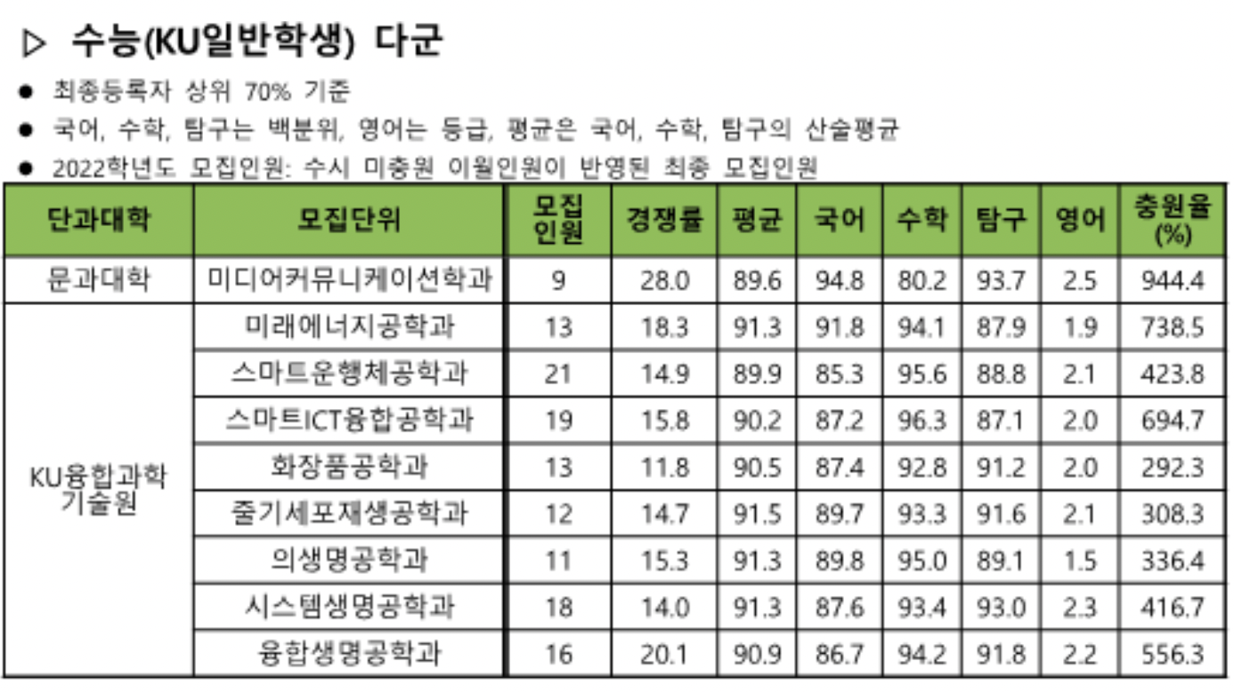 먼저 건국대학교의 2022학년도 정시 입결입니다. 백분위로만 나와있는데 전반적으로 80후반 90초반으로 보이네요. 이는 '최종'등록자의 70% 커트라인으로, 대략 2등급 학생들이 안정적으로 지원해볼 수 있겠습니다. 물론 3등급 초반 학생들도 경쟁률을 보고 지원할 경우 충분히 승산이 있어 보이네요. 특이한 점은 절대평가인 영어에서 3등급은 보이지 않는다는 것인데요, 지난번 포스팅에서 본 중경외시 라인 대학교 최종합격자 70% 커트라인에서는 영어 3등급도 아주 간혹 찾아볼 수 있었던 것을 보면 상대적으로 높습니다.