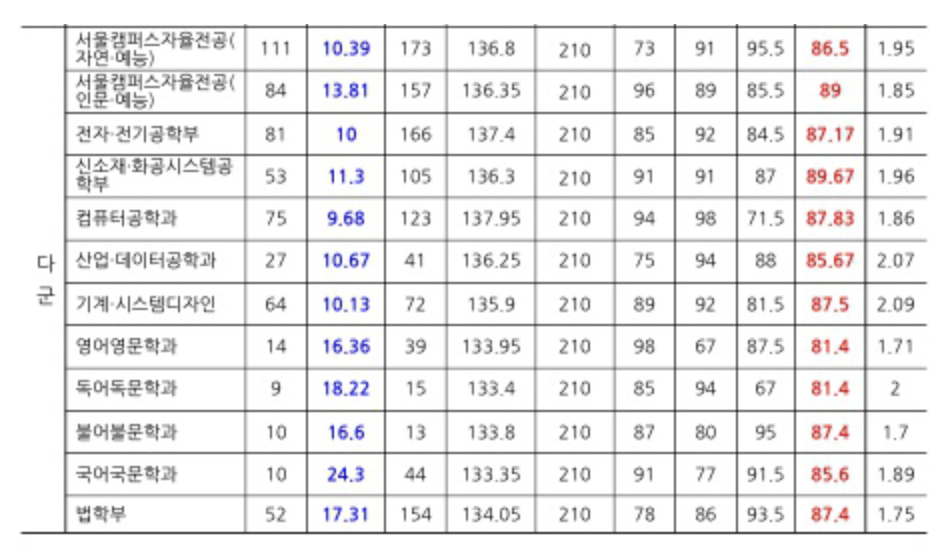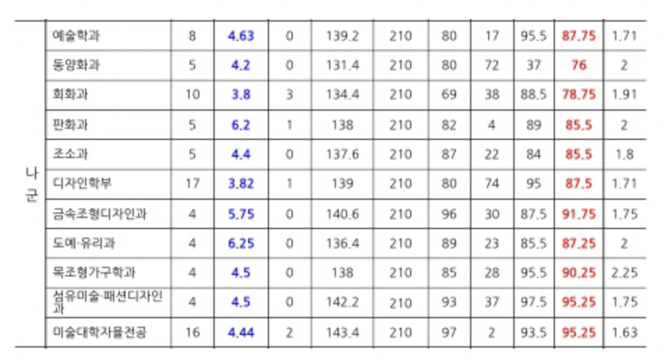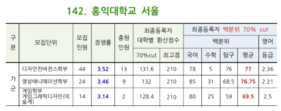 홍익대학교는 아무래도 미술로 유명한 만큼, 미대 학생들은 백분위가 그렇게 높지 않아도 됩니다. 물론 실기실력이 아주 뛰어나야 하기 때문에 아무나 입학할 수는 없죠. 만약 미대를 지원하는 학생이 아니라면 다군을 보시면 되는데, 전반적으로 백분위가 80대에 포진해 있는 것을 볼 수 있습니다. 이 역시 최종등록자 상위 70%를 나타내는 표이기 때문에 2등급을 받은 학생들은 무난하게 입학할 수 있을 것으로 보이며, 3등급을 받은 학생들도 영어 성적이 좋다면 지원해볼 수 있을 것 같네요.
