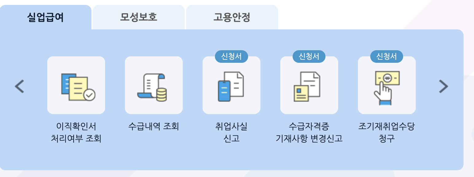 위 사진은 고용보험 홈페이지에서 개인으로 받을 수 있는 서비스의 전체 메뉴입니다. 확실히 실업급여 탭이 가장 넓은 것을 보실 수 있는데요, 실업급여 말고도 모성보호(육아휴직 관련)에서도 많은 서비스를 얻으실 수 있으니 꼼꼼하게 확인해보시는 것이 좋겠습니다.