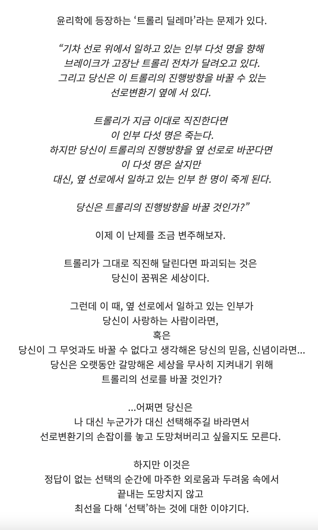 트롤리딜레마를 아시나요? 트롤리란 윗 사진처럼 노면전차를 말합니다. 교통수단 중 하나로, 예전에 사용하던 것이라 요즘은 볼 수 없는데요. 트롤리딜레마란 윤리학에서 가정하는 실험 중 하나로, 브레이크가 고장난 트롤리가 달려오는 상황에 과연 다수를 구하기 위해서 소수를 희생시킬 수 있는지를 물어봅니다.