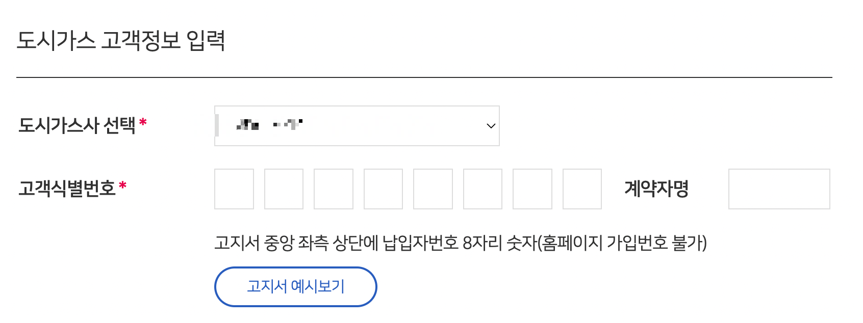 이처럼 도시가스사 이름 뿐만 아니라 고객 식별번호까지 입력해야 해서 평소에 도시가스사의 이름을 알고 계셨다고 해도 반드시 고지서는 필요한데요, 고객 식별번호는 고지서의 좌측 상단에 '납입자번호' 라고 표기된 8자리의 숫자를 말합니다.