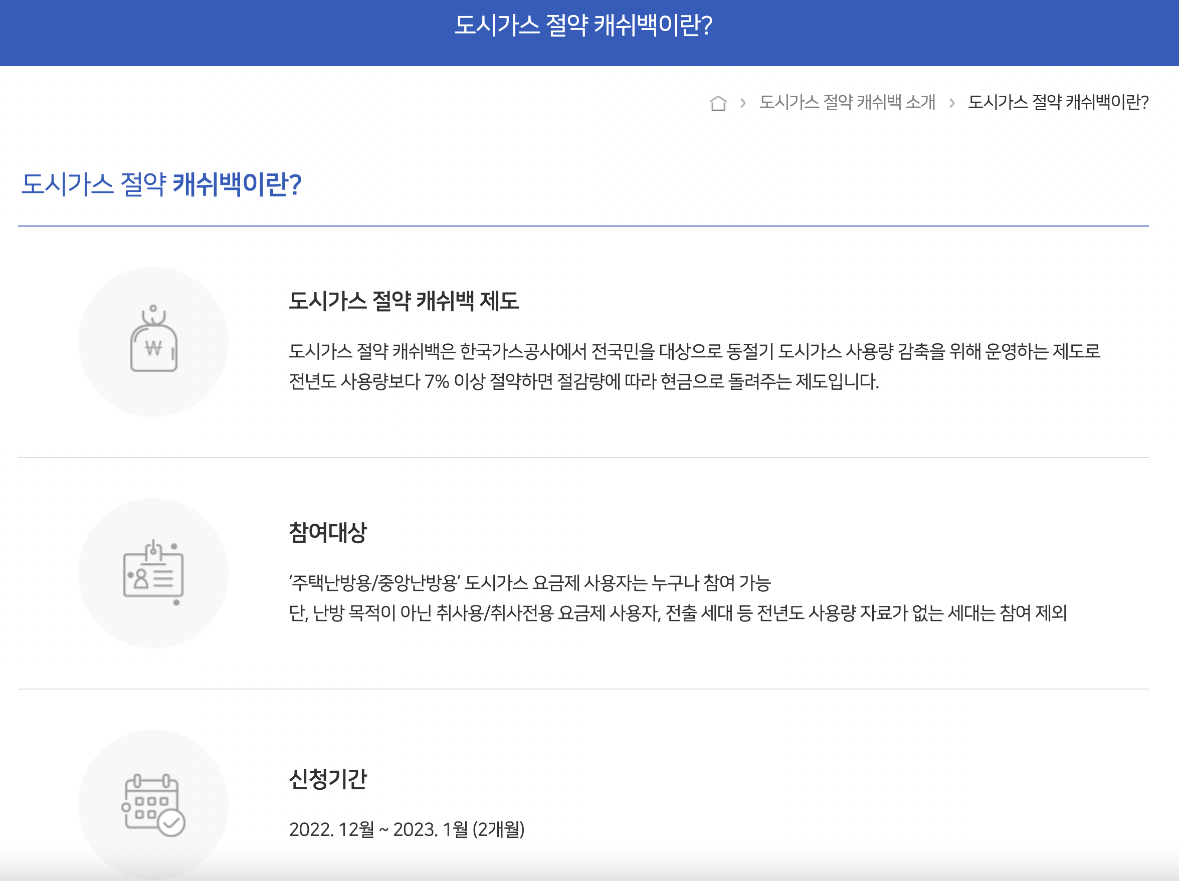 '도시가스캐쉬백'은 한국가스공사에서 우리나라 국민들을 대상으로 동절기 기간동안의 사용량 감축을 위해 운영하는 제도입니다. 주된 요지는 전년도 사용량보다 7% 이상 절약했을 시에 그 절감량에 따라서 현금으로 돌려준다는 것인데요, 주택난방용/중앙난방용 도시가스 요금제 사용자라면 누구나 신청이 가능합니다.