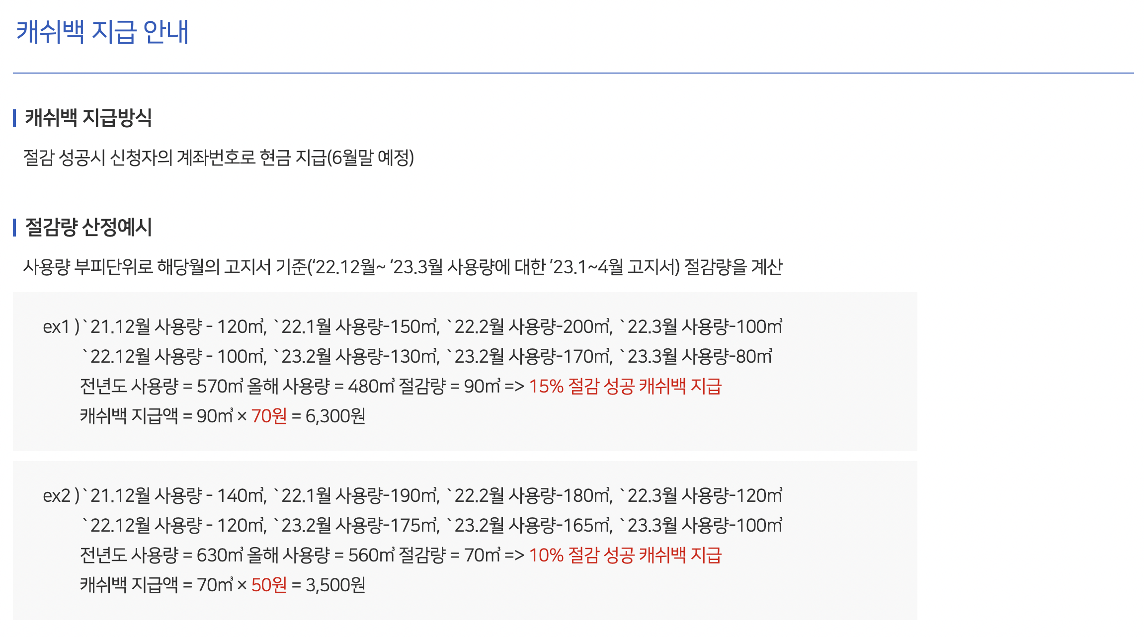 절약 기간은 작년 12월부터 올해 3월까지로, 고지서 발행으로 따지면 올해 1월부터 4월까지 발행된 고지서로 확인 가능합니다. 또한 캐시백은 7%이상 절감시 30/m³원, 10%이상 절감시 50/m³원, 15%이상 절감시 70/m³원으로, 절감율에 따라 캐시백 지급 단가가 달라집니다.