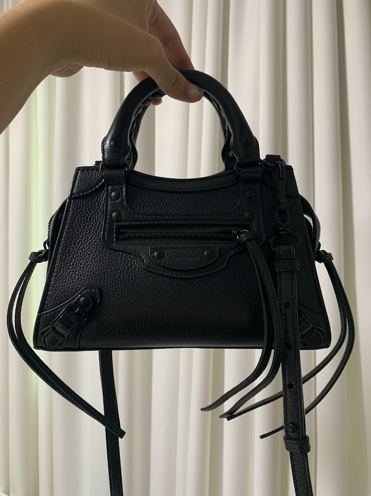 그러던 중 발견한 발렌시아가 네오시티백. 2021년 봄 당시에 신상이었다. 예~~전에 아마 20년 전인가? 발렌시아가 모터백이 한창 유행했을 때 너무너무 예뻐보였던 기억이 있어서인지 이 가방을 보자마자 너무 마음에 들었다. 사이즈는 라지부터 미니, 그리고 나노사이즈까지 다양한데 나노사이즈는 손바닥만한 마이크로백이라 나한테 맞지 않고, 스몰은 말이 스몰이지 나한테는 좀 크기 때문에 미니백이 딱이었다. 크기는 대충 남자 손바닥보다 조금 큰 정도?