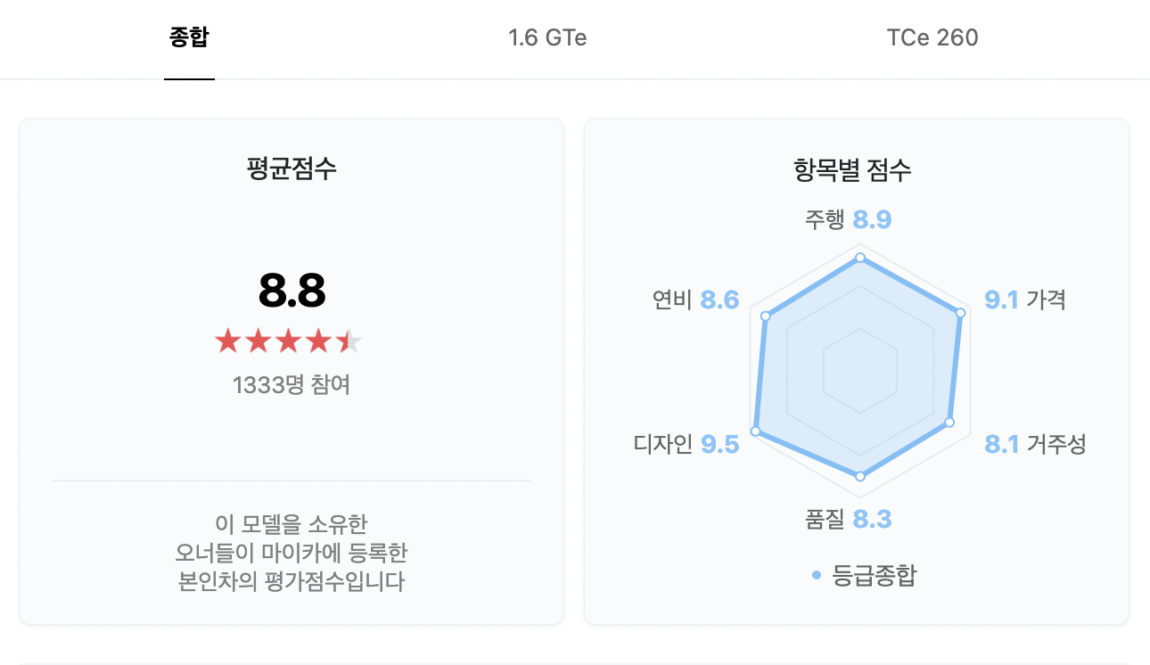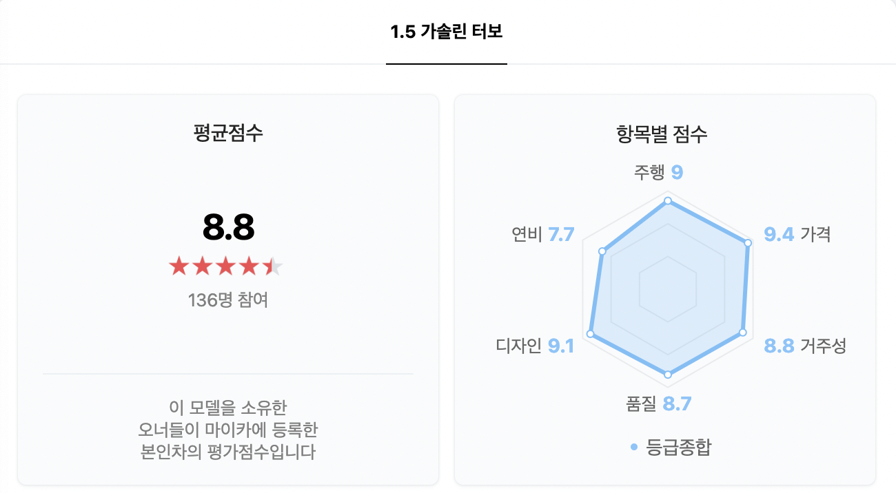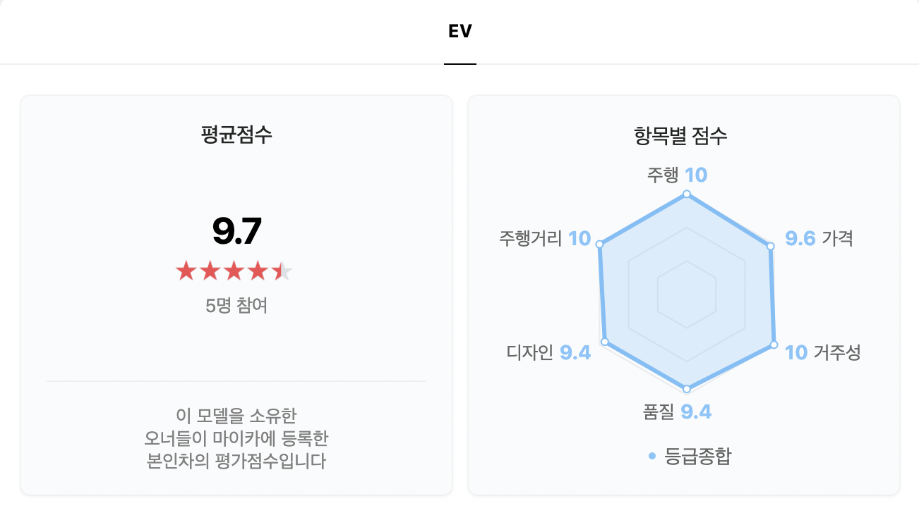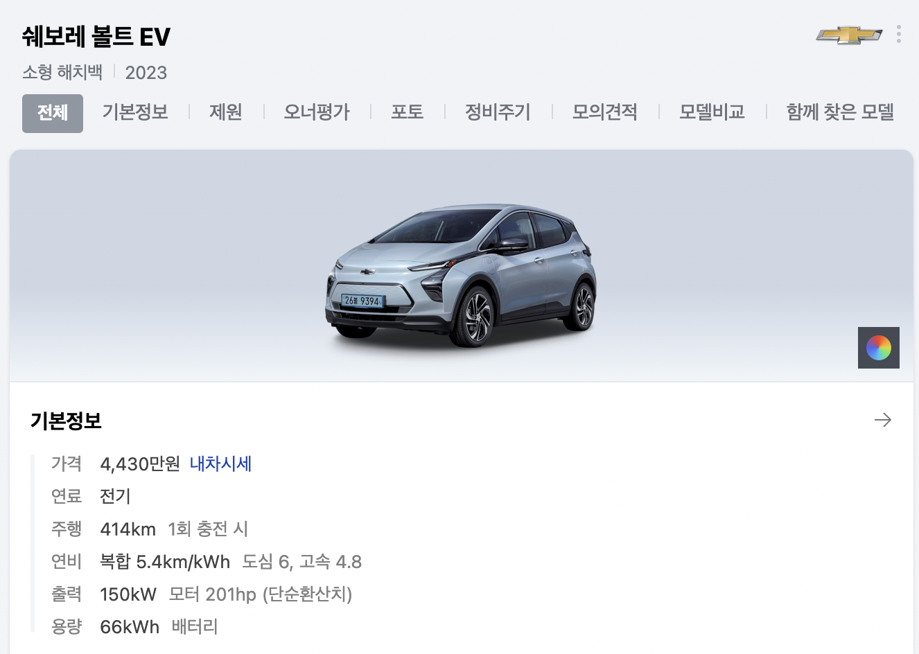 쉐보레 볼트를 소유한 차주들의 평가는 전반적으로 아주 높았습니다. 평점이 9.7인데요, '가격이 조금 올랐지만 가성비가 최고인 전기차이다', '시내주행이 많다면 전기차가 좋다', '디자인은 아주 예쁜데 중간에 300만원을 올려서 가성비 만점은 아니다' 라는 평가가 있습니다.