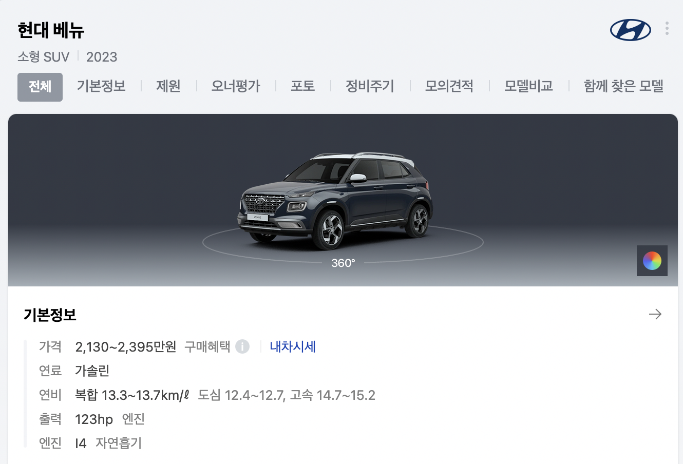 다음은 현대자동차의 베뉴 입니다. 1.6 가솔린 엔진을 장착한 소형 SUV차량입니다. 가격은 2130만원부터 2395만원까지, 보통 2000만원 초반대로 구매 가능합니다. 연비는 13.7km/l 정도이며 여성분들에게 주로 사랑받는 차량입니다.