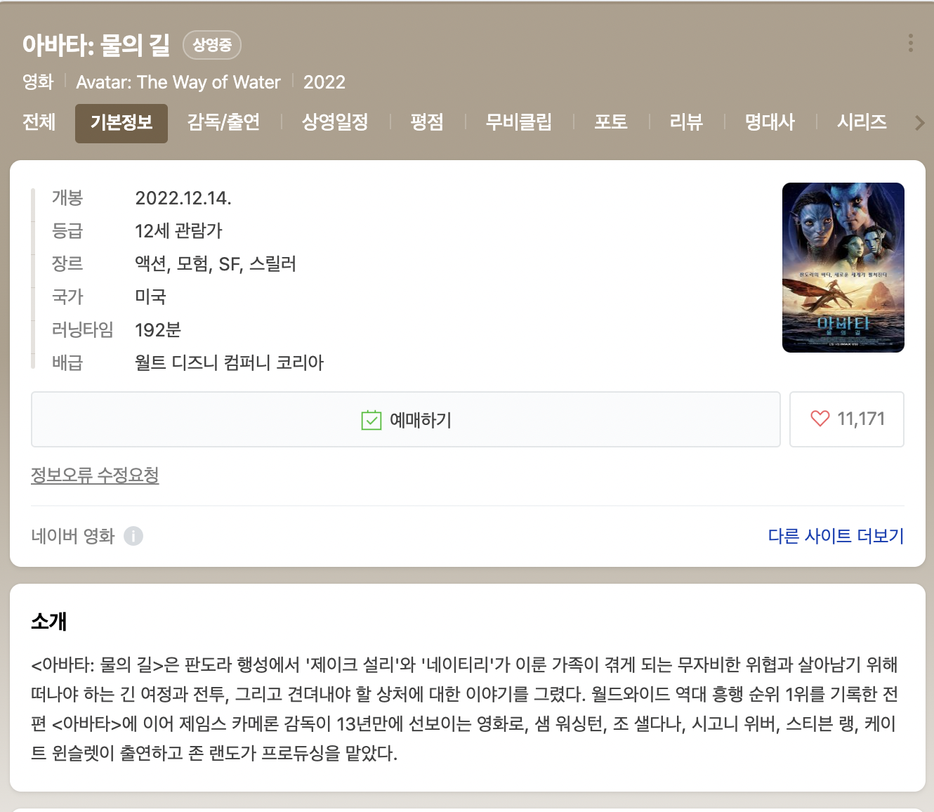 아바타 : 물의길은 아바타시리즈 2편으로 제이크 설리와 네이티리가 가족을 이룬 후 겪게 되는 이야기입니다. 12월 14일 개봉했고, 12세 관람가네요. 러닝타임이 3시간이 넘는 192분으로 굉장히 길기 때문에 마음의 준비를 하고 가시길 바랍니다. ㅎㅎ 화장실 꼭 다녀오시고 밥도 든든하게 먹고 오시길, 아니면 간식거리라도 든든하게 챙기시길요.