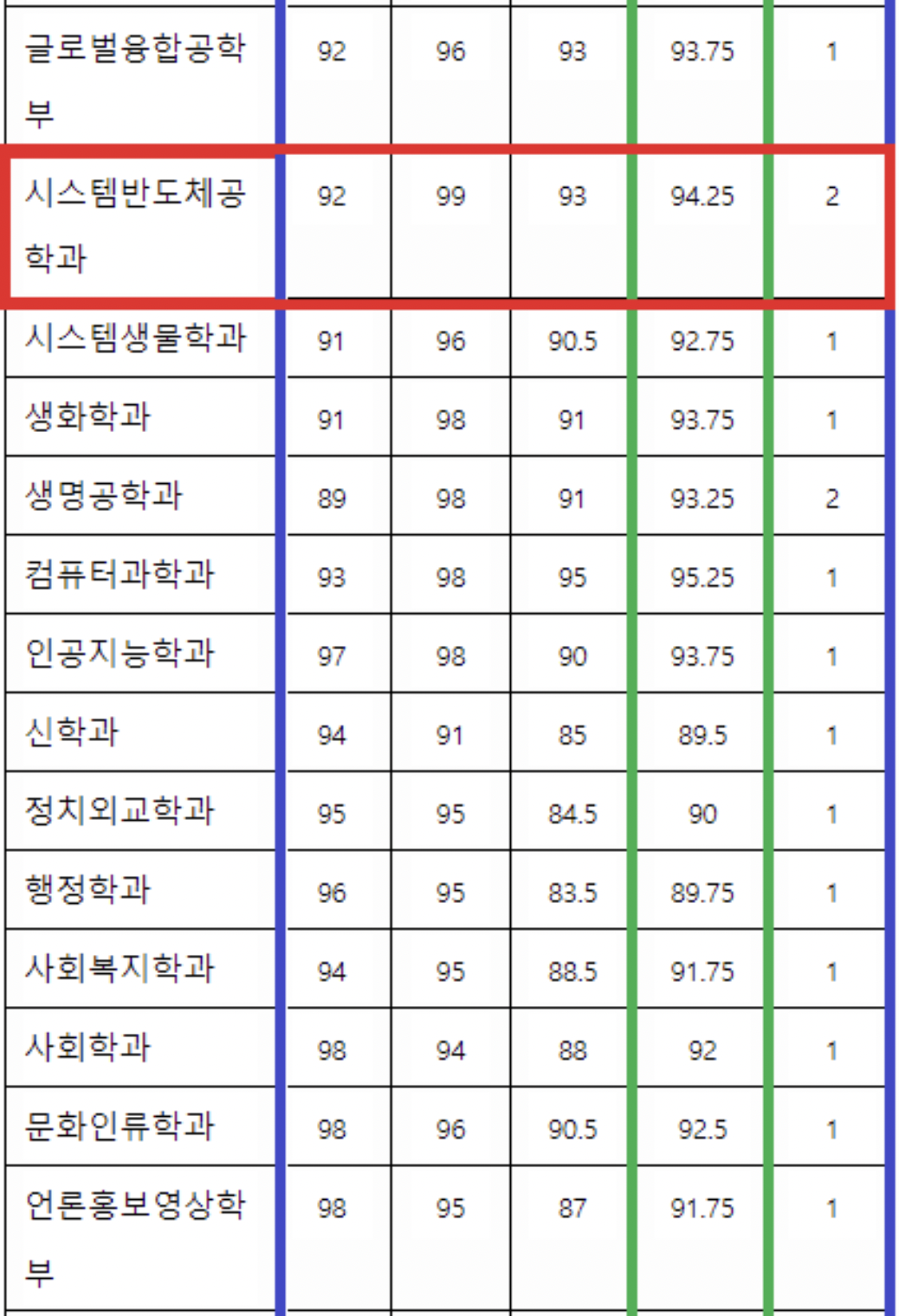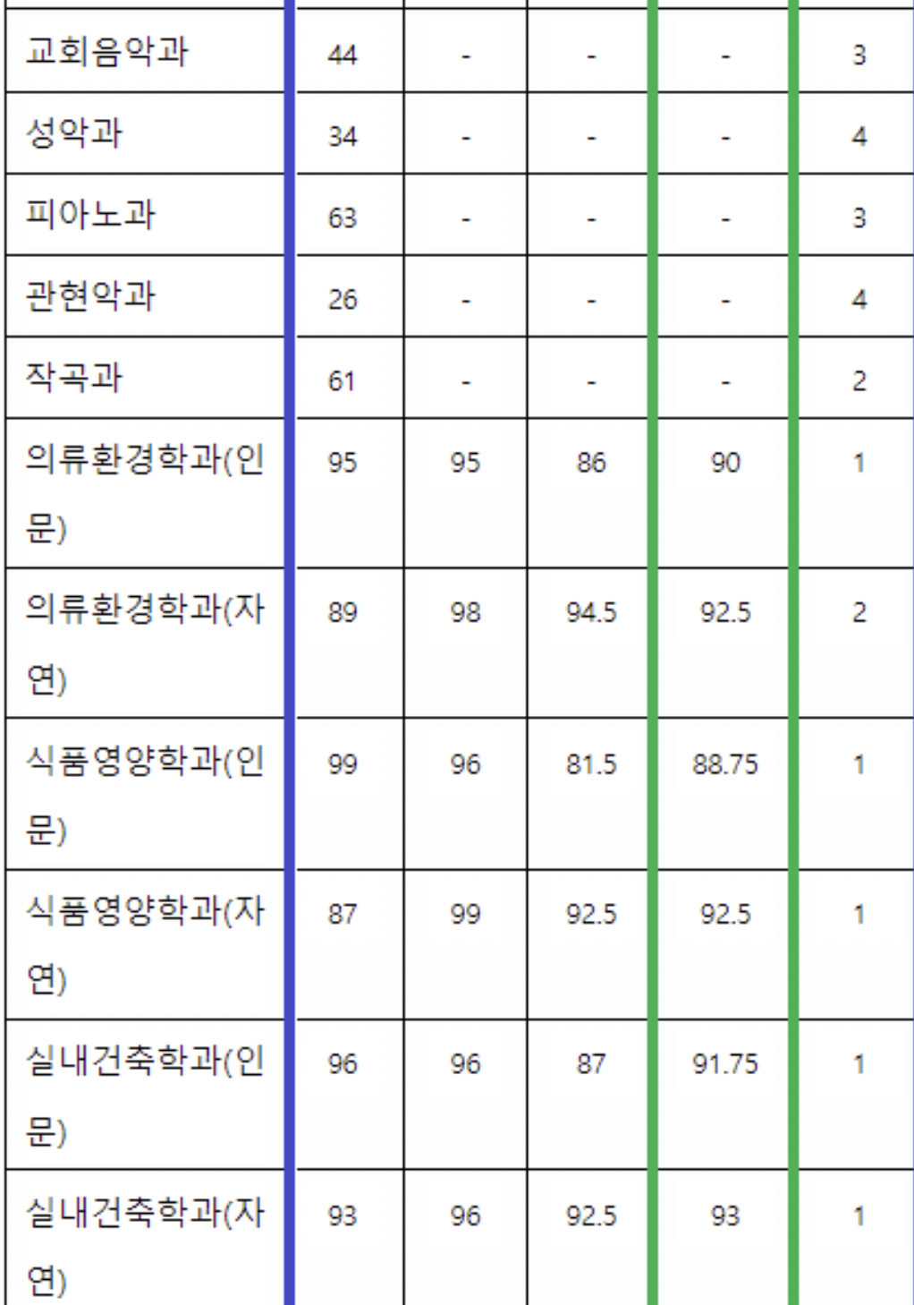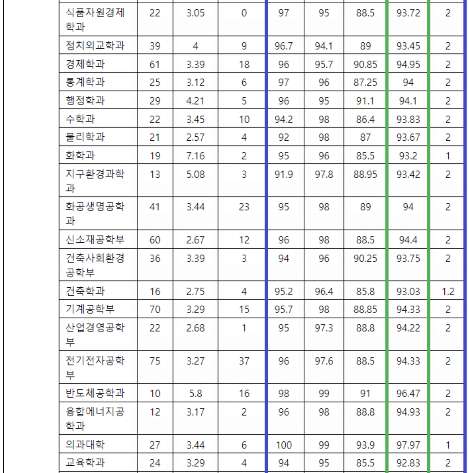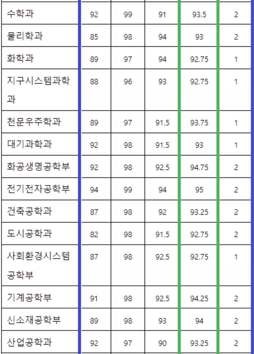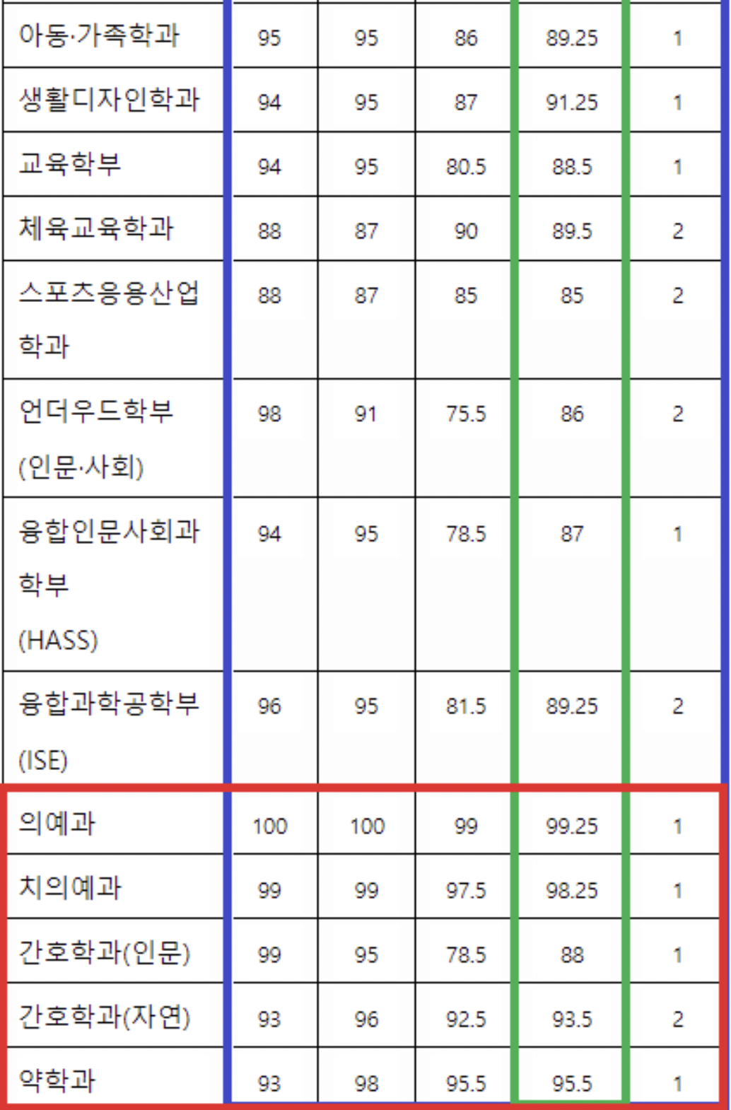 먼저 연세대학교입니다. 연세대학교의 영어등급의 평균부터 보자면 당연히 1등급이어야 안정권입니다. 2등급이 나왔다고 해서 지원을 못 하는 것은 아니나, 이 표는 '최종'등록자의 70% 커트라인이기 때문에 1등급을 받아야 안정적으로 최초합이 가능할 듯 합니다. 국수탐은 모두 백분위 90대가 나와야 하는 것으로 보아, 마찬가지로 모두 1등급을 받은 학생들은 안정적입니다. 그러나 모든 과의 백분위가 95 이상은 아니기 때문에 2등급이 있다고 해도 평균 백분위가 90대라면 충분히 지원해볼 수 있을 것 같습니다. 특히 인문계열의 경우 수학영역이 2등급이 나왔다고 해도 국어와 영어가 1등급이 나왔다면 충분히 승산이 있습니다.