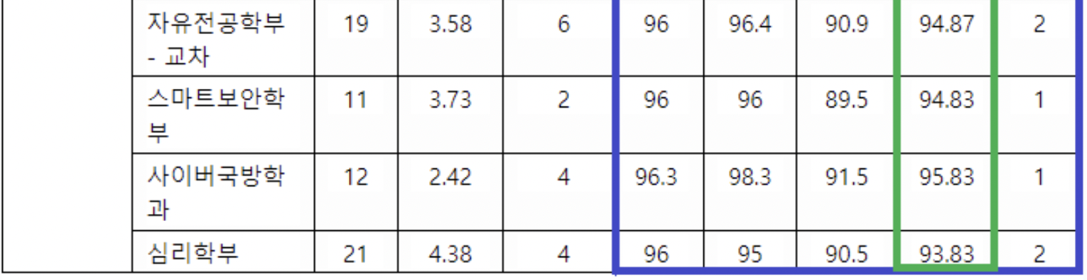 다음은 고려대학교입니다. 고려대학교의 경우 영어등급이 조금 더 낮습니다. 전반적으로 2등급이어도 안정적으로 합격하는 선으로 보이네요. 하지만 국수탐 영역에서는 연세대학교와 마찬가지로 높은 성적을 받아야 하는 것으로 보입니다. 오히려 과에 따라서는 연세대학교보다 국수탐 성적을 더 많이 보는 것으로 나타나기도 하네요. 똑같이 상위권 학생이어도 영어등급이 몇이냐에 따라, 국수탐 평균이 몇이냐에 따라 연세대학교에 지원하는 것이 유리할 수도 있고 고려대학교에 지원하는 것이 유리할 수도 있겠습니다. 어쨌든 평균 등급이 1.5 정도 되면 연세대학교든 고려대학교든 지원이 가능하겠네요.