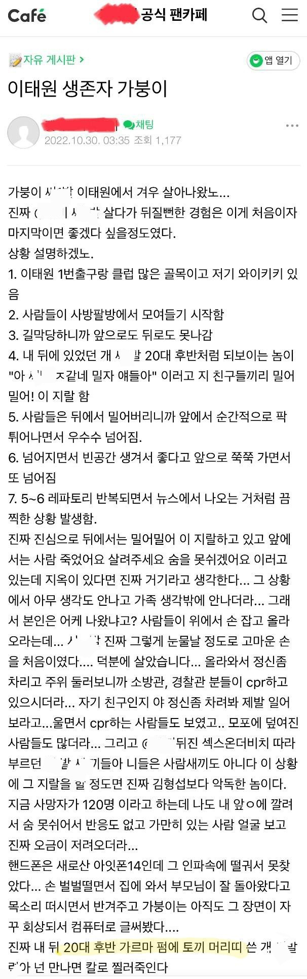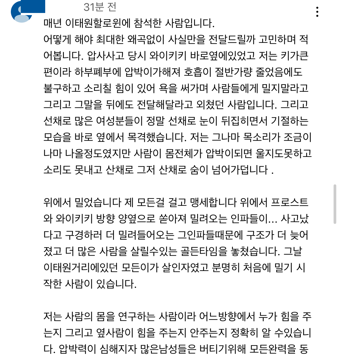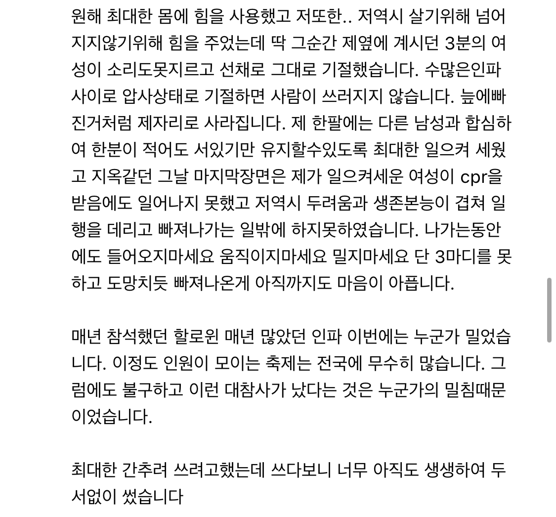 이것은 sns 서비스에 올라온 새로운 댓글로, 이 누리꾼 역시 누군가가 밀침으로 인해 이 사고가 시작된 것이라 증언하고 있다. 이것이 정말 사실이라면 제대로 된 사실관계를 파악하여 반드시 범인을 잡아내 책임을 물어야 할 것이다. 이번 일로 죄 없는 젊은 사람들이 너무나도 많이 희생당했다. 다시 한 번 삼가 고인의 명복을 간절히 빈다.