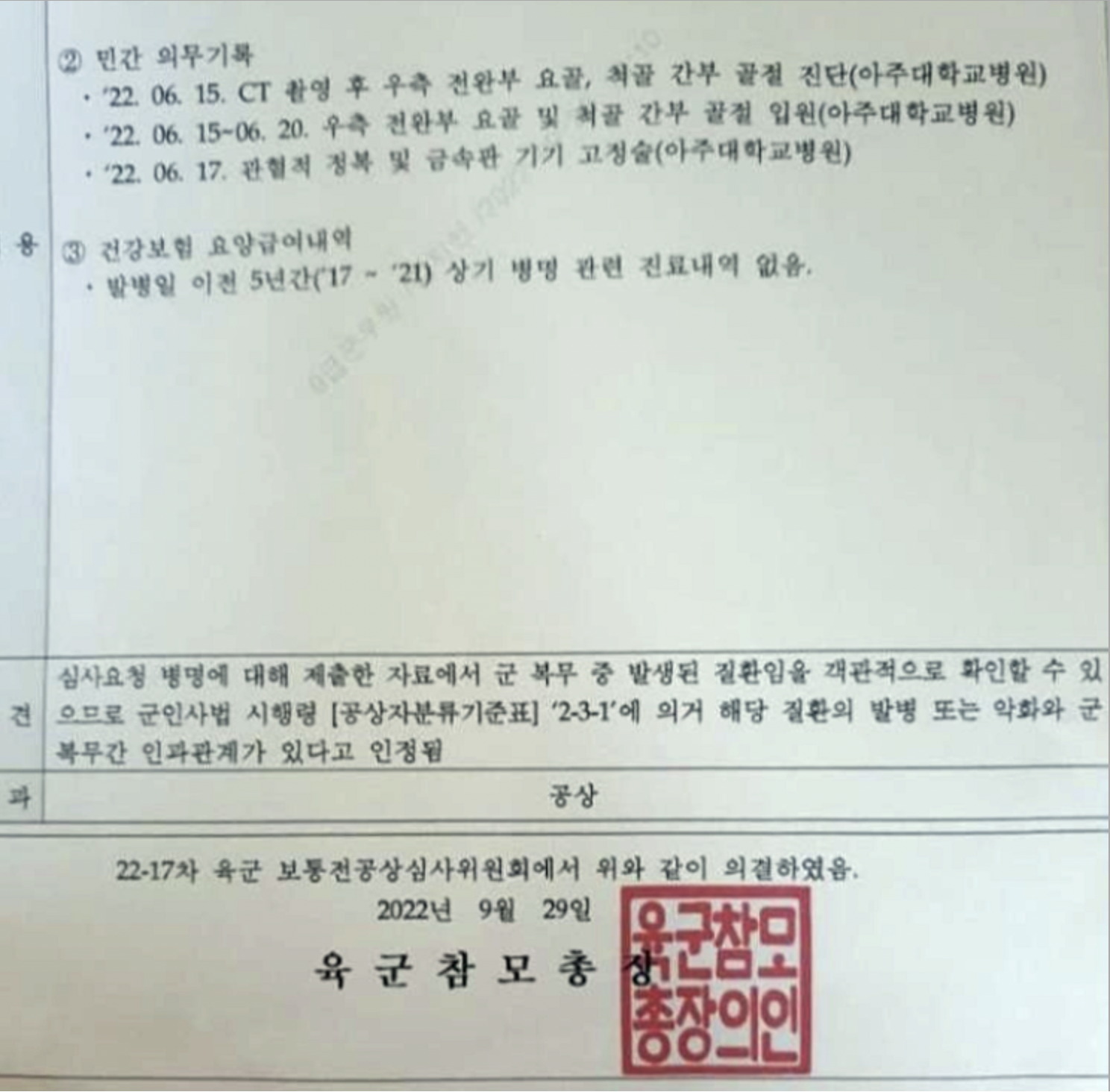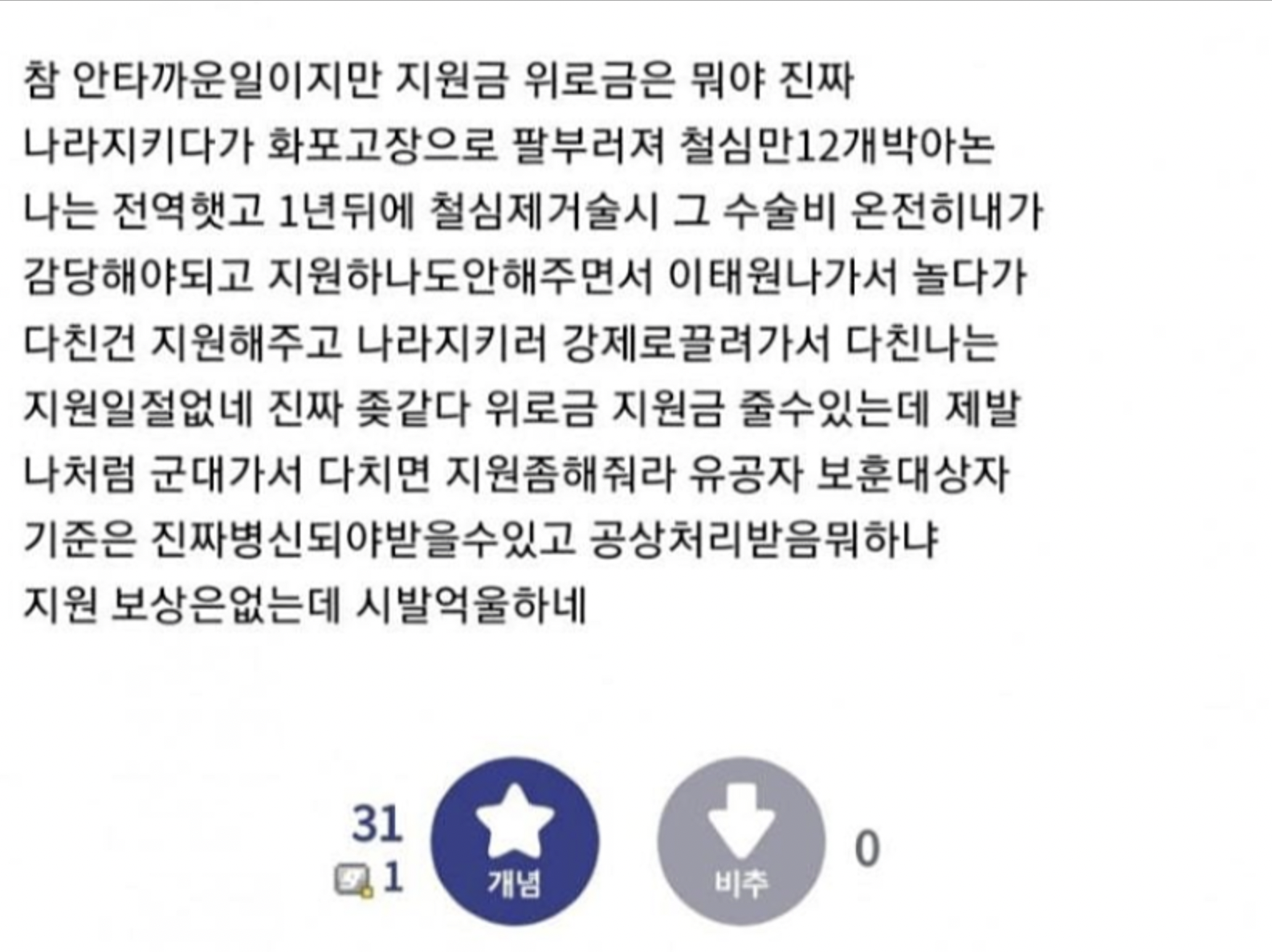 1년 뒤에 철심을 제거하는 수술을 해야 하는데 이 수술비에 대한 지원이 하나도 없는 실정에 대해 한탄스러움을 늘어놓으며, 이태원 희생자들에게 위로금과 지원금을 줄 수는 있으나 군대에서 나라 지키다가 다친 사람들에게도 지원이 필요하다는 글이었다.