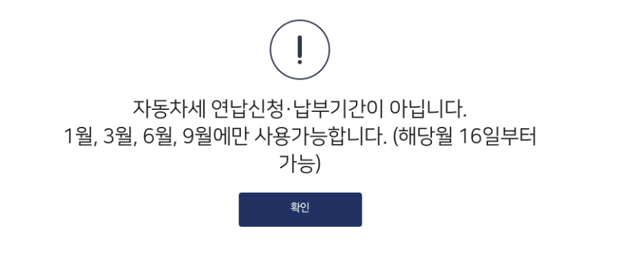 연납신청 가능 기간이 아닐 때는 이런 팝업창이 뜨기 때문에 꼭 해당 일자에 들어가셔서 연납신청 하시길 바랍니다. 혹시라도 연납을 원했으나 해당 날짜에 납입을 못했다면 다음 연납일에 다시 신청하시고 납입하시면 됩니다. 하지만 할인율 적용은 받지 못하는 점 참고해주세요.