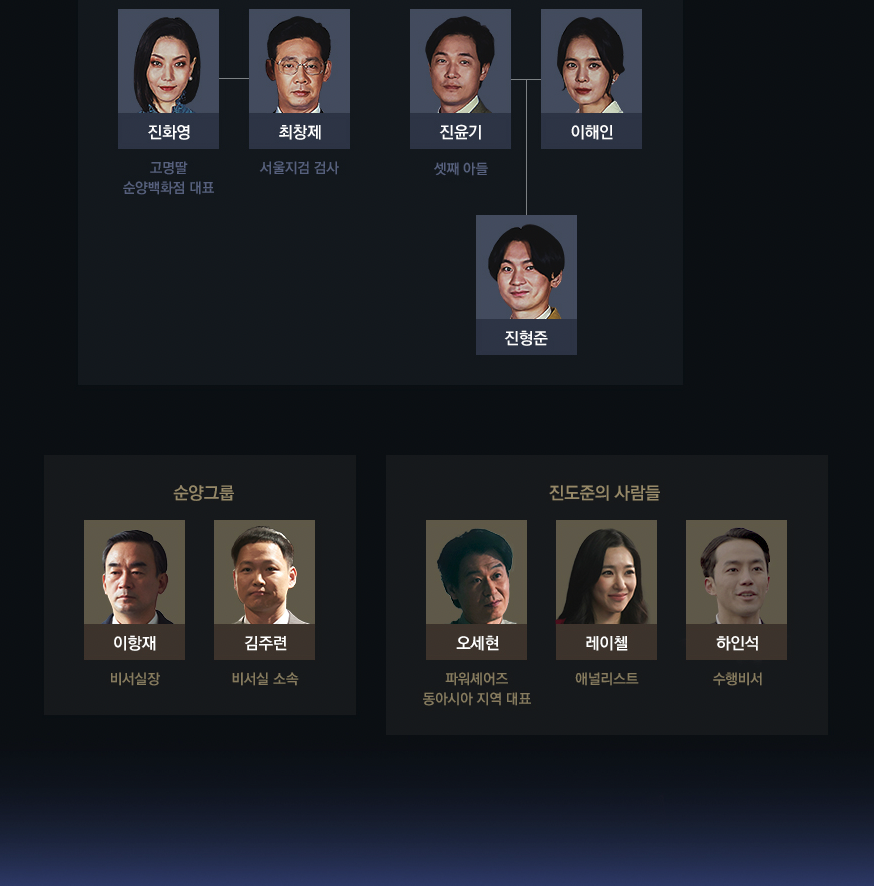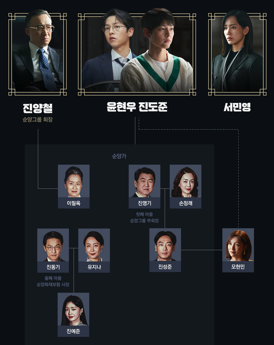 배우 이성민이 연기하는 진양철은 순양의 창립자이자, 진도준의 할아버지입니다. 순양은 재계1위 기업이며 진양철은 후계자를 필요로 하는 인물이라 자식들 중 누구에게 순양을 물려줘야 할지 늘 고민하고 있으나, 어쩐지 본인과 닮은 것 같은 유일한 손자 진도준을 유력하게 생각하고 눈여겨보고 있습니다.
