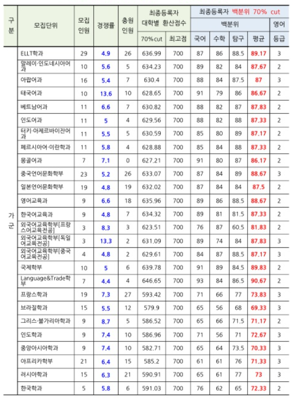 한국외대의 경우는 중앙대, 경희대와는 조금 다른 입결입니다. 작년 데이터로 봤을 때 전체적인 백분위가 살짝 더 낮은 것을 확인할 수 있고, 비인기과의 경우 (표의 하단 부분) 영어를 3등급 받은 학생들도 최종등록을 했네요. 문과성향 학생들이 많이 지원하는 학교인 만큼 수학 백분위도 꽤 낮은 것을 알 수 있습니다.