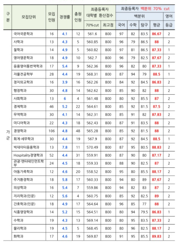 경희대학교는 작년 입결을 보니 최'종' 등록자의 백분이 70% 컷이 80대 후반인 것으로 나오네요. 최초합이 아니라 다른 학교로 빠질 학생들은 다 빠지고 '최종적으로' 등록한 학생들의 성적 중 70% 커트라인 수치인 것인데요, 역시나 중앙대와 크게 달라보이지 않습니다. 또한 국,수,탐은 상대평가라 변동이 있을지라도 영어는 무조건 2등급 안으로는 받아야 안정적인 지원이 가능할 것으로 보이네요.