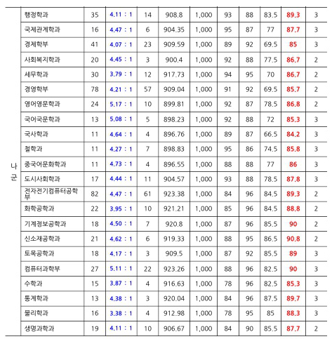 서울시립대 역시 문과 성향의 대학교라고 볼 수 있는데요, 영어가 외대와 비슷하게 2-3등급으로 포진되어 있습니다. 하지만 국,수,탐의 경우에는 중앙대나 경희대와 크게 다르지 않고 오히려 인기과 (도시공학과 등)는 경희대보다도 한결 높은 백분위를 보여주네요. 영어가 상대적으로 약하지만 다른 과목에는 강한 학생들이 지원해볼만한 학교인 것 같습니다.