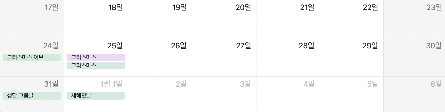 작년 크리스마스가 일요일이었기 때문에 올해 크리스마스는 월요일이 되겠습니다. 따라서 남은연차를 전부 사용하시면 즐거운 연말을 보내실 수 있을 것 같은데요, 26일 화요일에 연차를 내시거나 22일 금요일에 연차를 내시면 크리스마스를 포함하여 4~5일간의 휴가를 즐기실 수 있겠습니다.