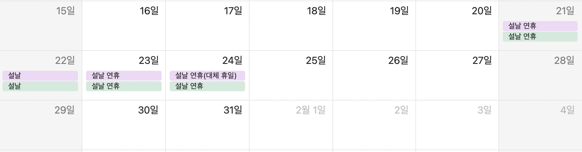 먼저 1월입니다. 설 연휴에 여행을 떠나고 싶으신 분들이라면 20일 금요일과 25일 수요일, 26일 목요일에 연차를 사용하세요. 설연휴는 21일 토요일부터 23일 월요일까지이며, 24일 화요일이 대체공휴일이기 때문에 이와 같이 연차를 사용하시면 20일 금요일부터 26일 목요일까지 쉬실 수 있습니다.