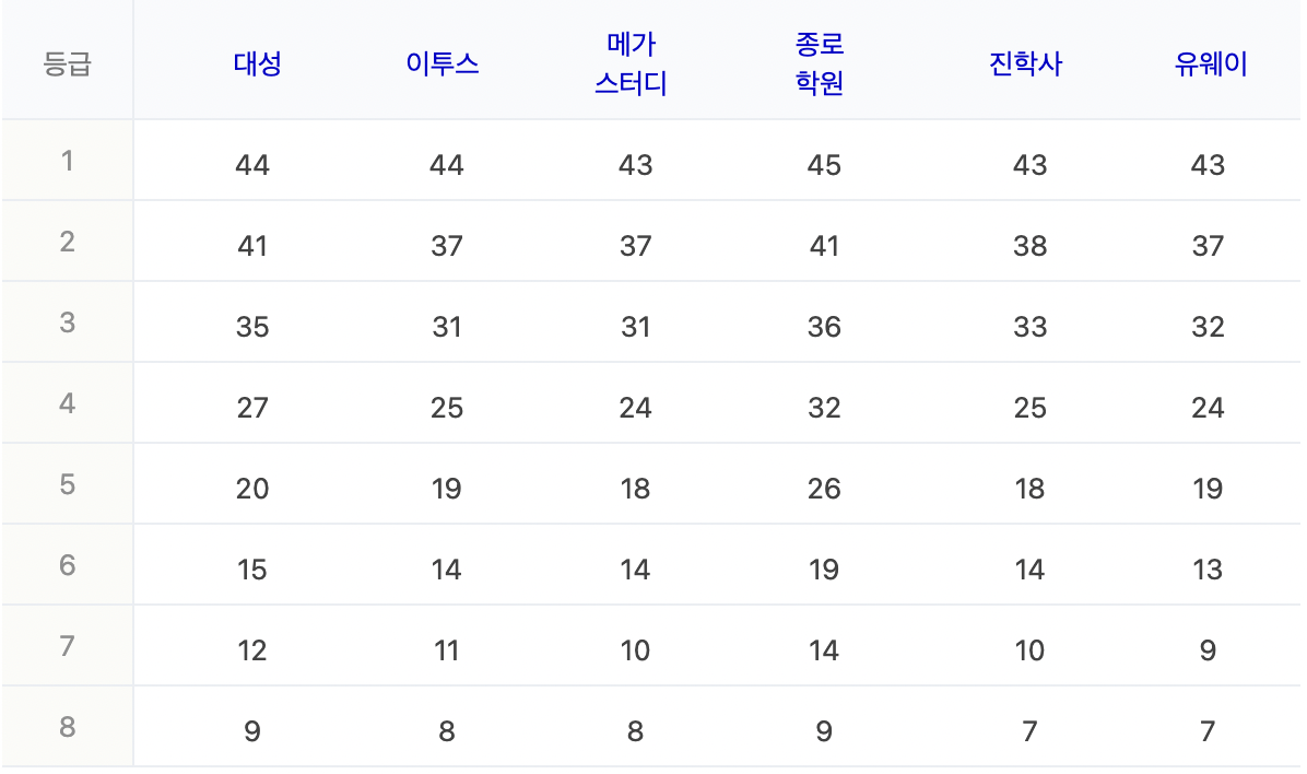 정치와법 과목은 1등급 예상 커트라인이 40점대 초반, 2등급 커트라인이 30점대 후반, 3등급 커트라인은 30점대 초중반을 기록하고 있습니다. 1등급 커트라인은 낮은 편이지만 등급 간의 점수 차가 별로 없어 1~3등급 사이가 치열했을 것으로 보입니다.