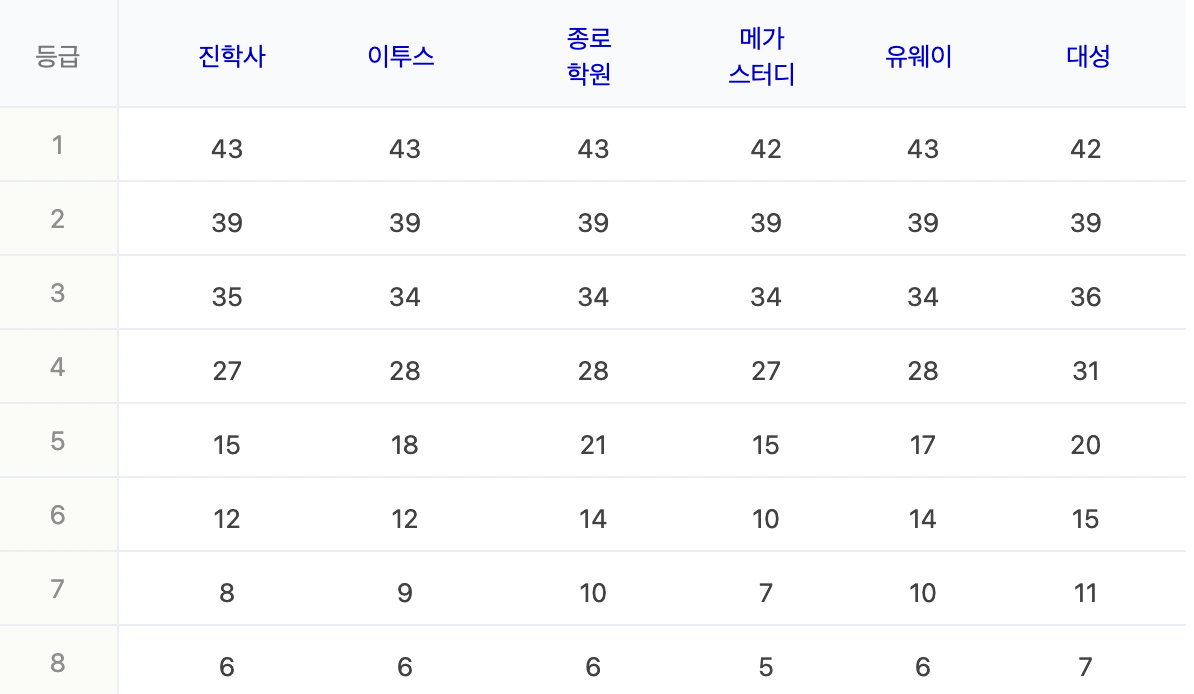 동아시아사도는 모든 기관에서 50점 만점을 1등급 커트라인으로 예상했습니다. 한 문제만 틀려도 2등급인 것인데요, 2등급 커트라인이 47점으로 동일하게 예상된 것으로 보아 한문제 싸움이 치열한 과목이었던 것 같습니다. 3등급 예상 커트라인은 30점대 초중반입니다.