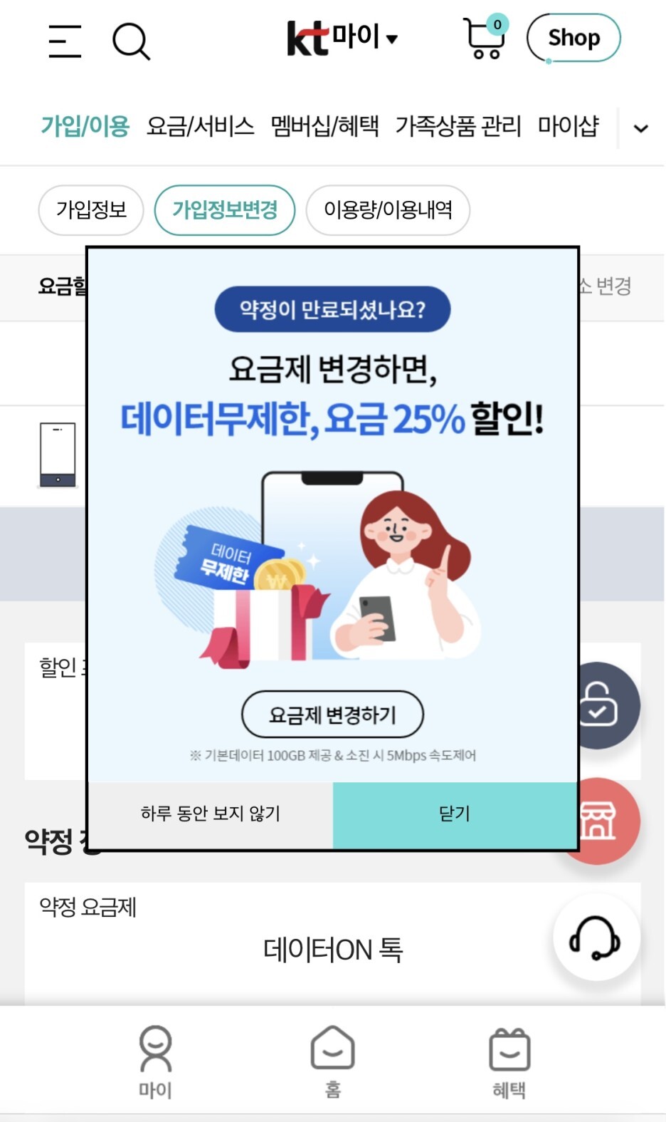요금제를 변경하고, 다시 홈 화면으로 갔더니 이런 배너가 뜨더라구요.