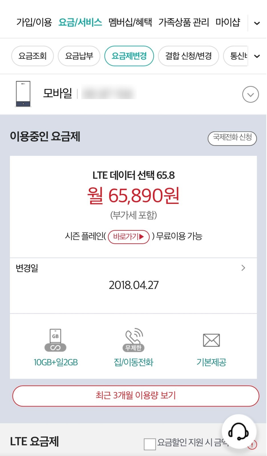 제가 현재 사용하고 있는 요금제는 LTE데이터선택65.8 인데요,