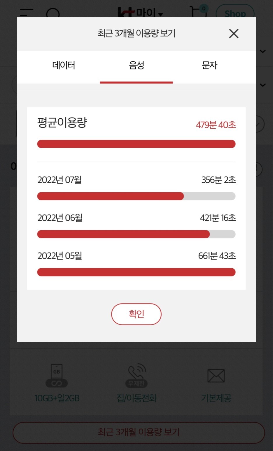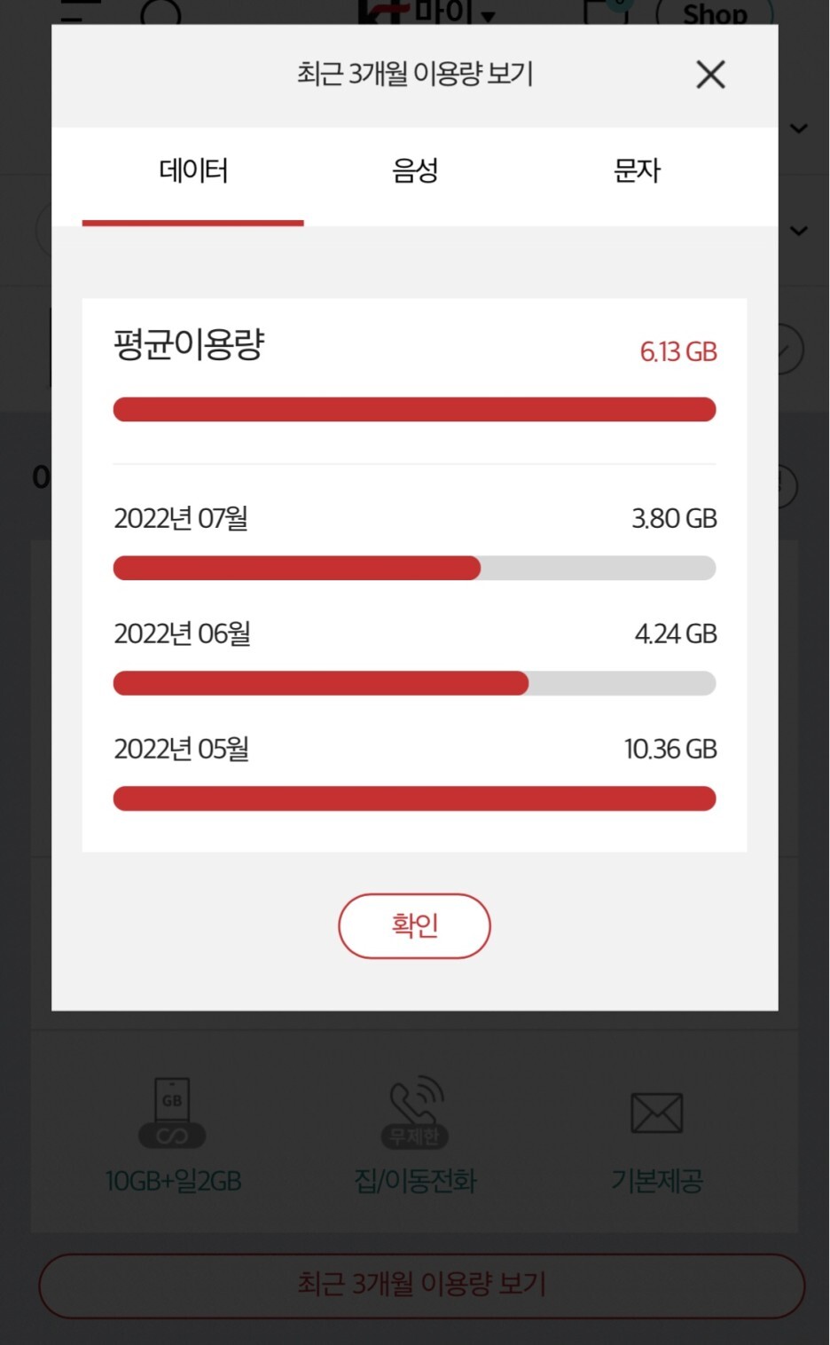 최근 3개월 평균 이용량을 알아볼 수 있게 되어있었는데요,