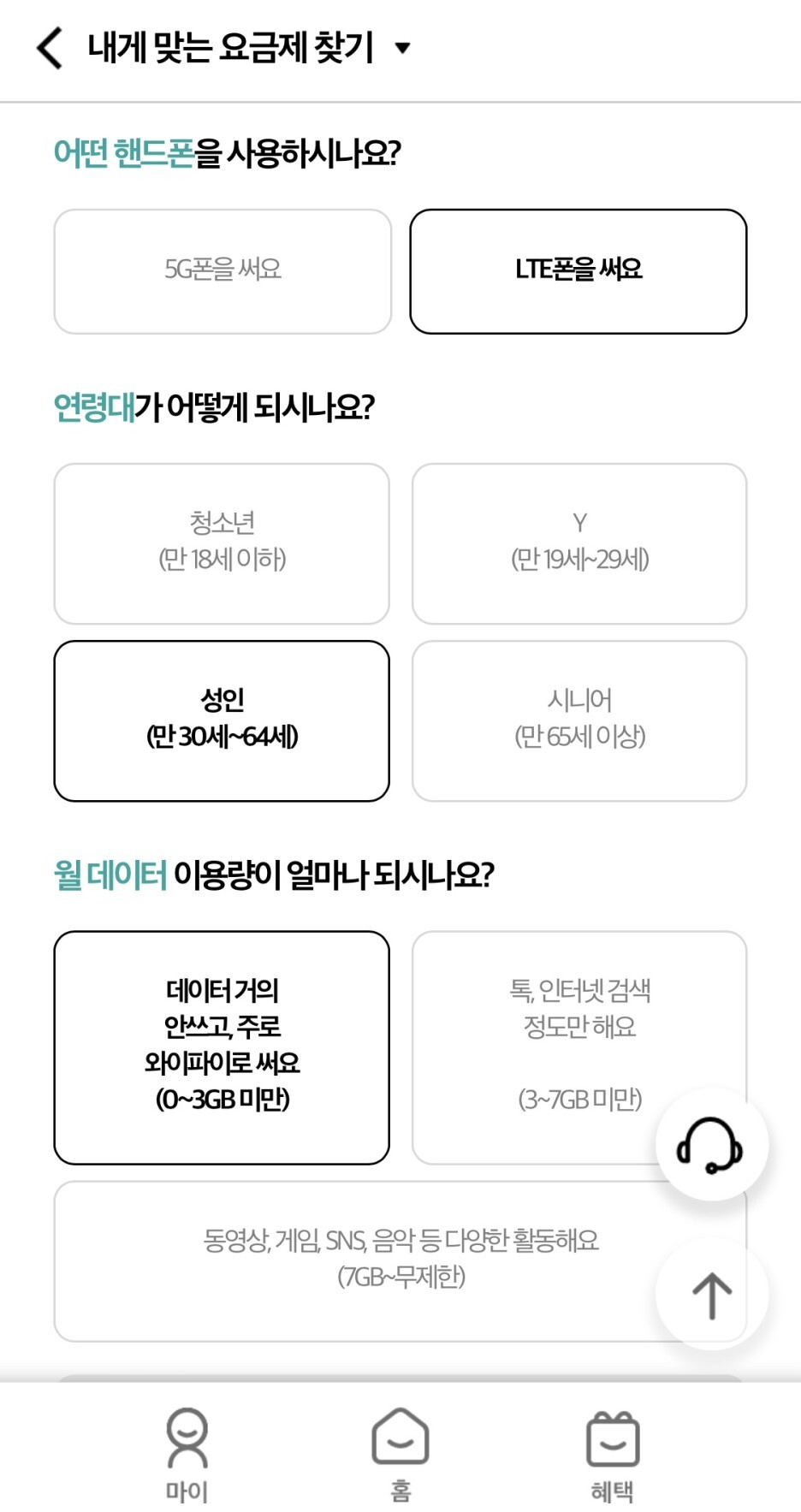 게다가, #내게맞는요금제찾기 라는 메뉴가 아예 있어서 위 사진처럼 저의 나이대와 원하는 요금 정도, 월 데이터 이용량 정도를 선택하면