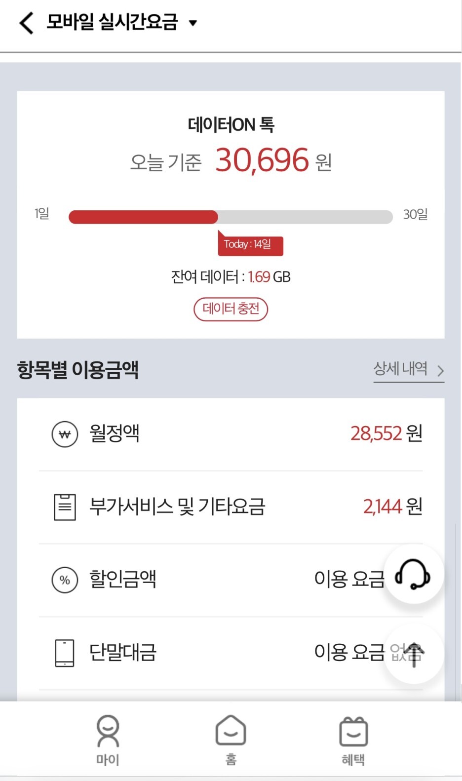 요금제를 바꾼 후 실시간 요금을 조회해봤어요.