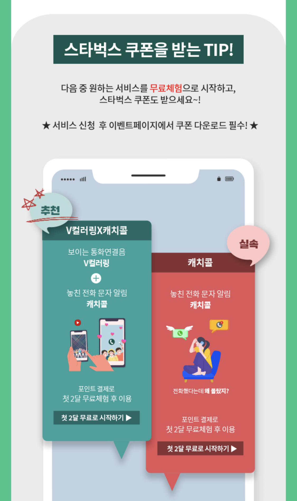 이렇게 캐치콜 서비스를 신규 가입 해주고, 다운로드 버튼을 눌러주면 쿠폰을 받으실 수 있습니다.